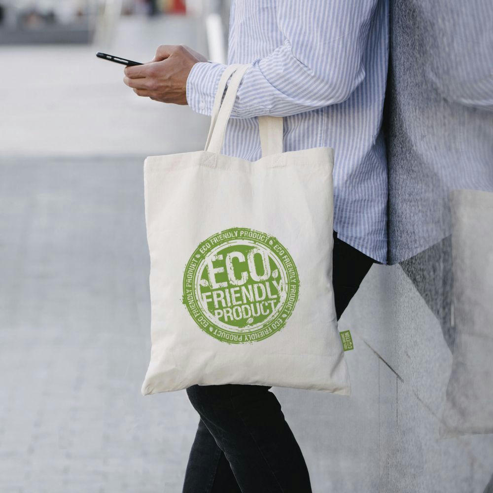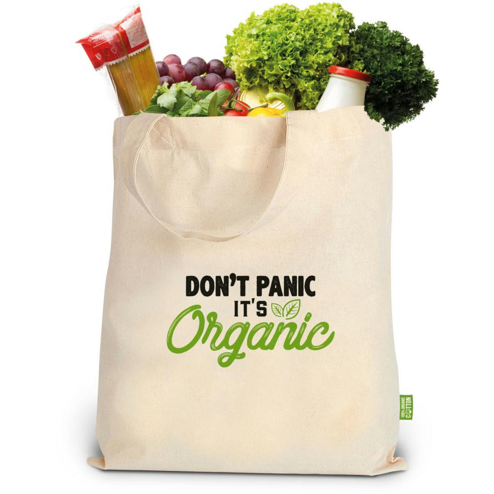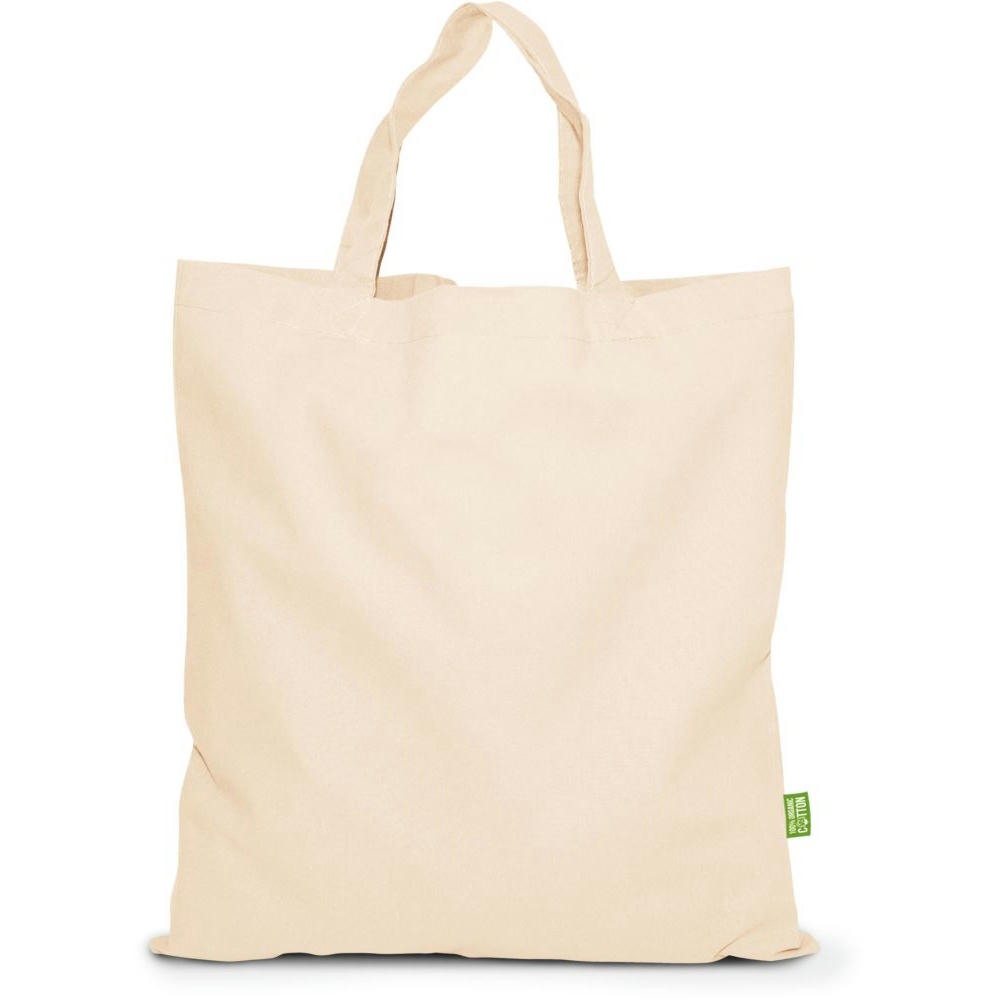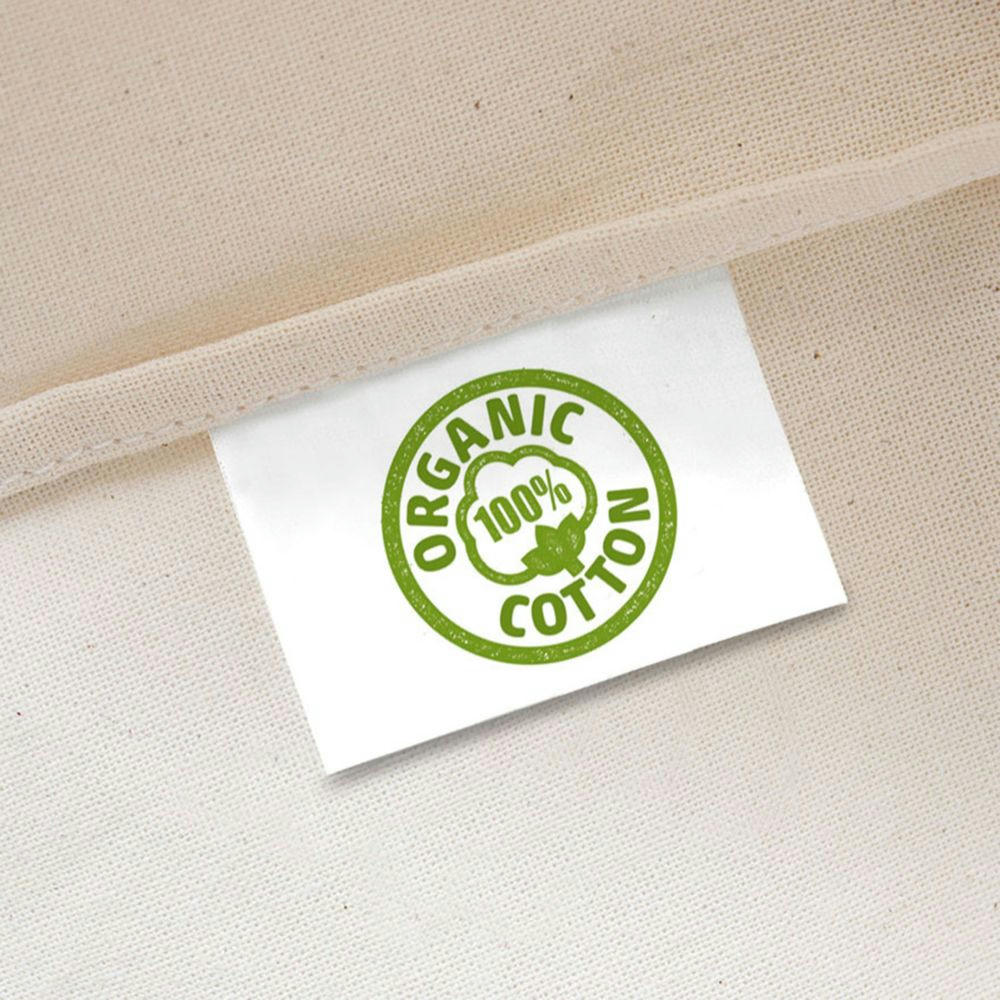 BIO-Baumwolltasche mit kurzen im Kreuzstich vernähten Henkeln und ORGANIC-cotton Label außen. Gegen Aufpreis auch mit langen Henkeln erhältlich.