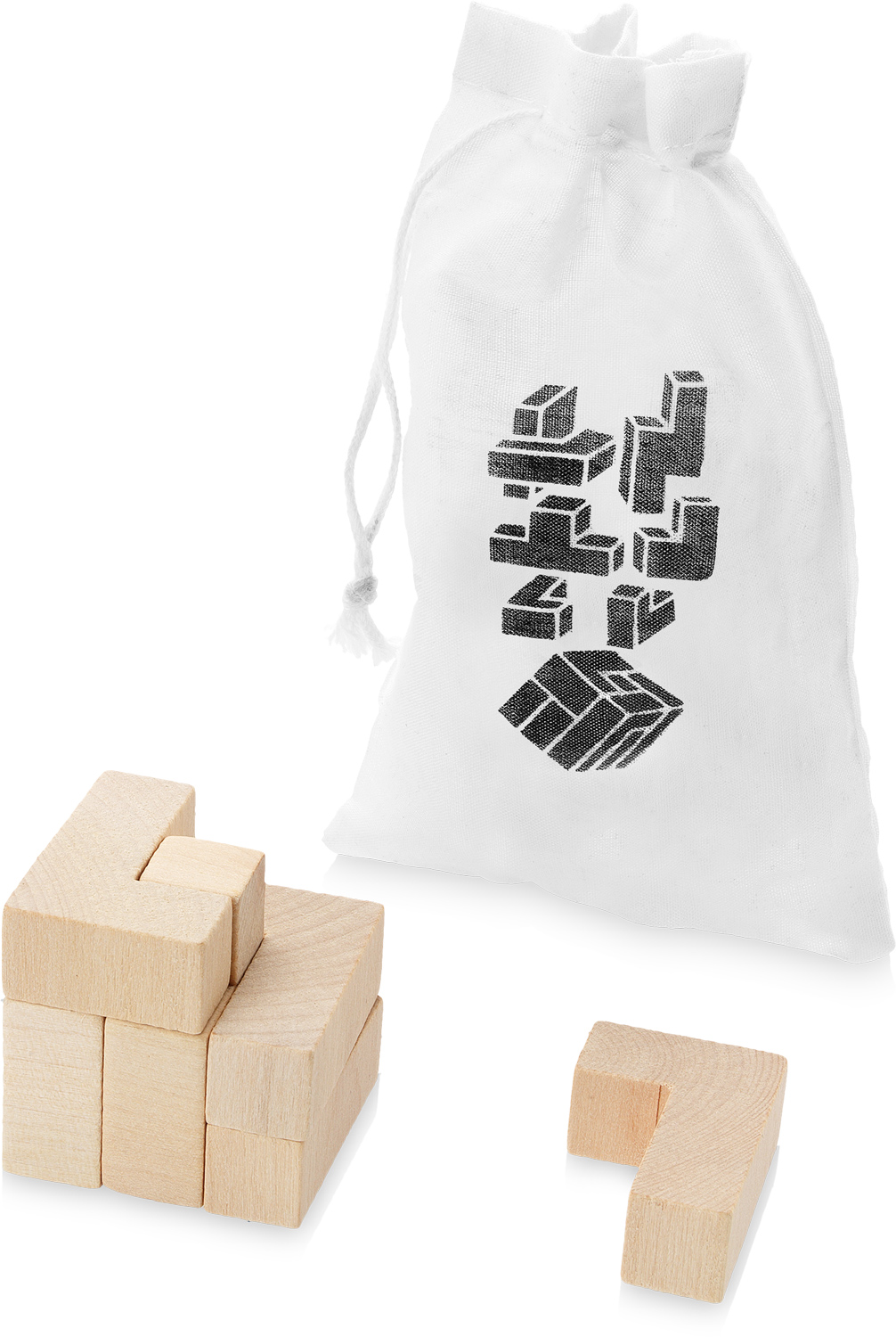 Puzzlesteine aus Holz in einem Baumwollbeutel.