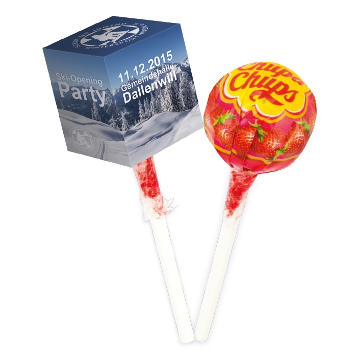 Chupa Chups Kugel Lolly in Werbebox aus weißem Karton, individuell bedruckt. Inhalt: CHUPA CHUPS Kugel Lolly, 12 g, in den Sorten Apfel, Orange, Erdbeere, Kirsche. Sorten immer gemischt. Haltbarkeit: 18 Monate.
