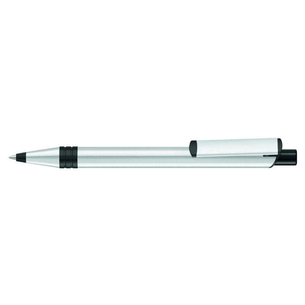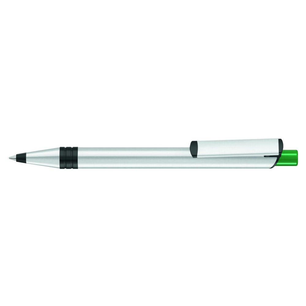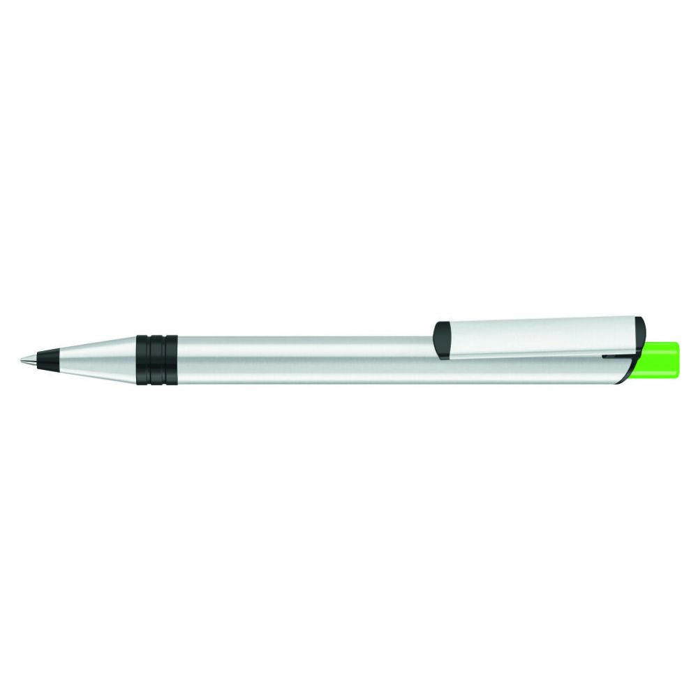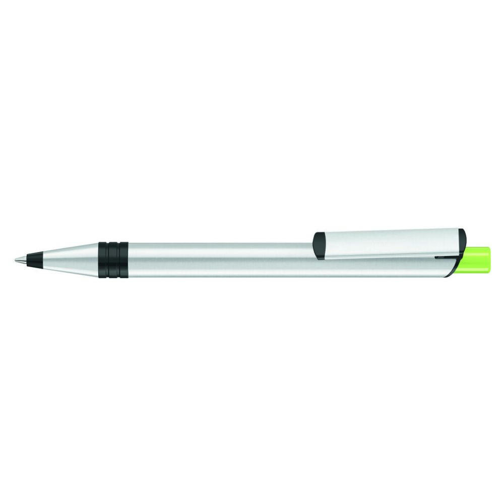 Metall-Druckkugelschreiber mit Metallspitze, Metallschaft und Metallclip aus recyceltem Aluminium, Kunststoffteile aus recyceltem PET-Material in gedeckt schwarz und gedeckt farbigem Drücker.
