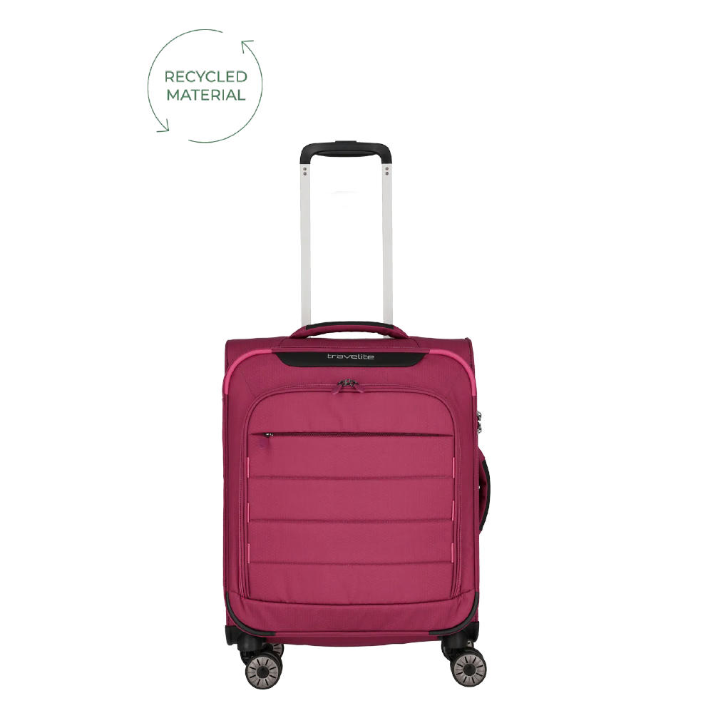 Material und Informationen: Außenmaterial Recyceltes Polyester Innenfutter Recyceltes PolyesterSchloss TSA-KombinationsschlossRollen 4 Doppelrollen mit 5,5 cm DurchmesserAusziehbare Teleskopstange arretierbares Leichtmetall-GestängeTragegriff ergonomische Oberhand- und Seitenhandgriffe und Bodengriff Separates Wäschefach jaGepolstertes Laptopfach neinErweiterbar (Dehnfalte) nein